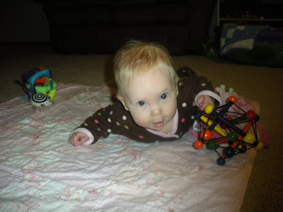 I have a feeling that Olivia won't be giving me a break either. She's already curious about everything. If she could, I'm sure she would be running right alongside Logan. She's trying so hard to crawl. She loves being on her tummy and will move in a circle. She can scoot a little bit. She tries so hard to move and gets frustrated that she can't, but someday soon she'll be on the move. I'm not looking forward to the day where I have to chase 2 little ones around the house.